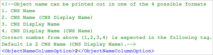 - In the <Columns> section of the template file, navigate to <ObjectNameColumnOption> and <ObjectPathColumnOption> tags, and type a value to specify the format in which the object name and its source path are printed. The following two code snippets provide the formats for the object name and source path.