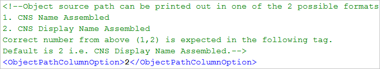 In the ObjectPathColumnOption example, the object source path prints along with the Common Naming System (CNS) display name. If you enter 1 as the value, the object source path prints along with the CNS name.