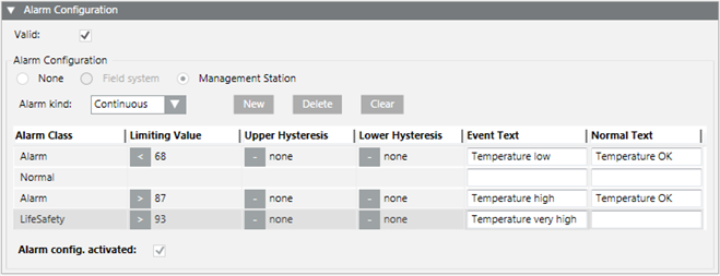 - In the Alarm Configuration expander, the Alarm config. activated check box is selected.