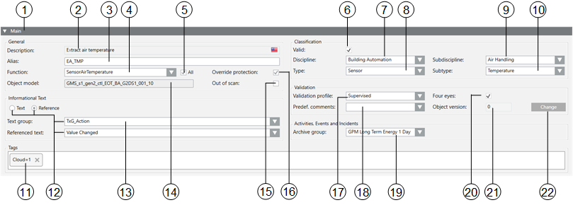 20 | Object version | Displays the number of saved user changes made to this object. The counter is increased by +1 for each Save In Edit mode, any number can be entered. The counter can be reset to 0 when handing the project to the customer. |