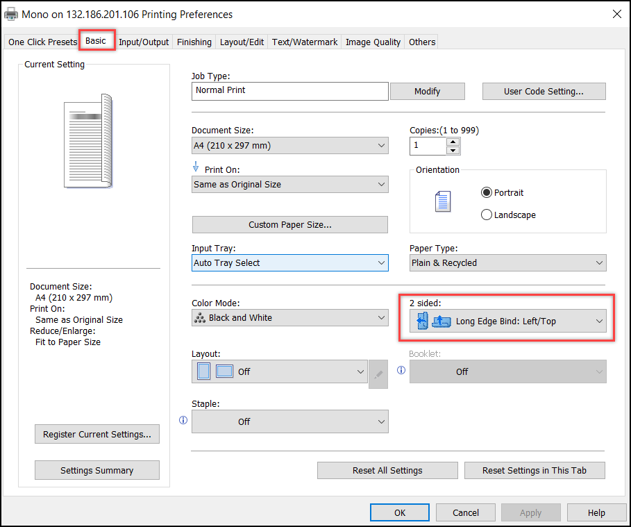 - In Basic settings, select Long Edge Bind printing option from 2-sided drop-down list and click OK.