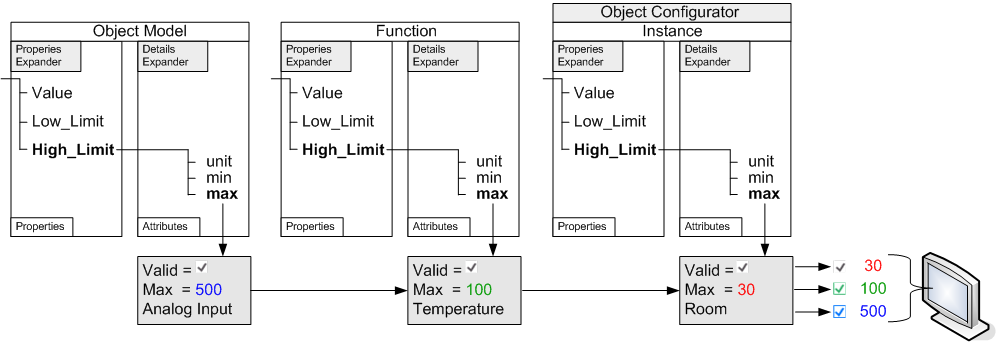 The figure below provides an overview on the interaction of object model, function, and instances, and the associated editors.