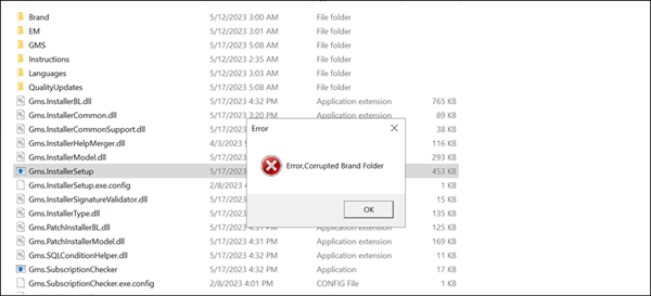 When you run Gms.InstallerSetup.exe from installation media, installation fails with an error “Corrupted Brand Folder”.